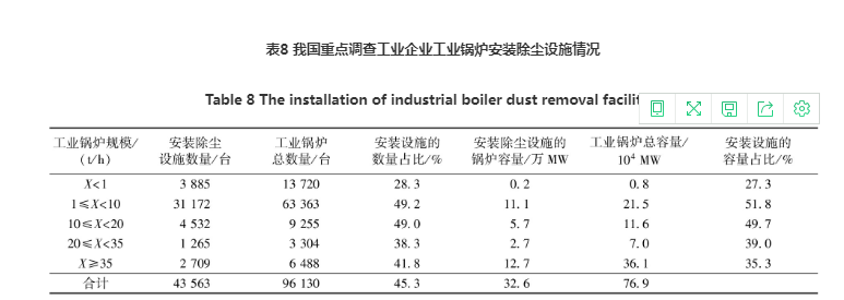 對安裝除塵設施的工業鍋爐分規模分析:小于1 t/h的工業鍋爐安裝除塵設施的比例最低,為28.3%;1≤X<10的工業鍋爐安裝除塵設施的比例最高,為49.2%。雖然從除塵設施的安裝比例來看,1≤X<10的工業鍋爐最高,但其煙粉塵排放強度遠高于規模更大的鍋爐,這說明工業鍋爐污染治理設施是否安裝是一方面,更重要的是污染治理設施的運行情況,僅安裝不運行或運行效果差,與未安裝基本無差別。詳見表8。